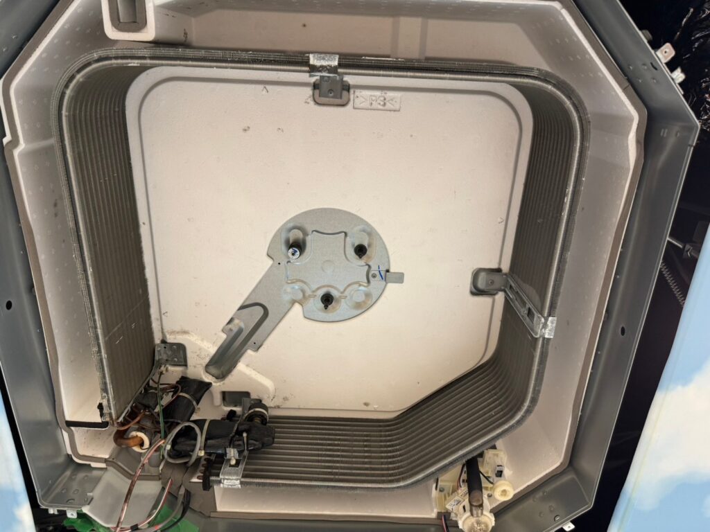 このドレンパン部分はエアコンを使用すると常に水に浸った状態になるので、カビが付着するのも致し方ない部分ですが、臭いやアレルギー症状が出る原因にもなるできっちり洗浄を行わせて頂きました。